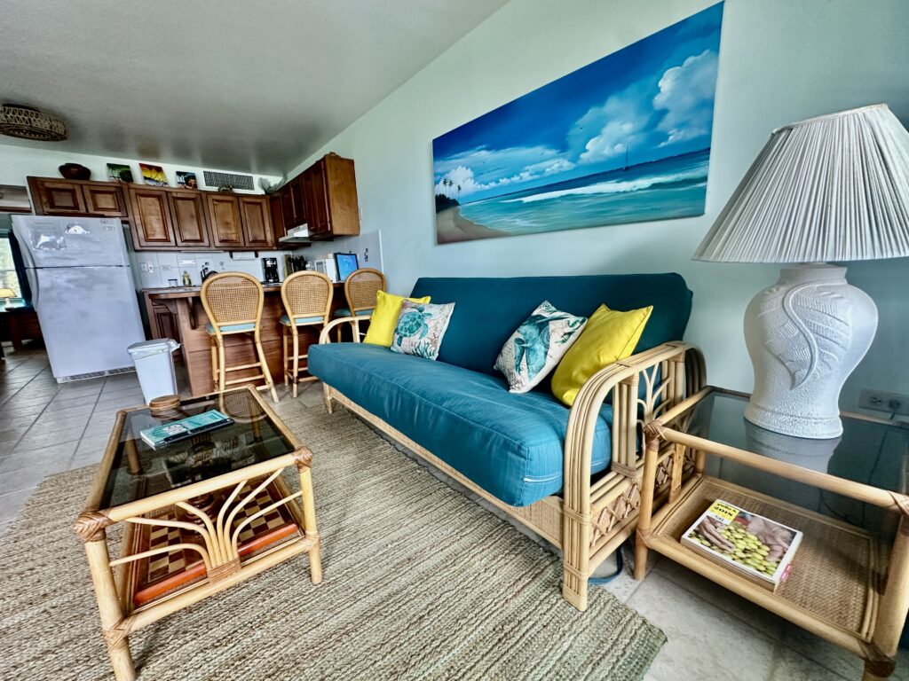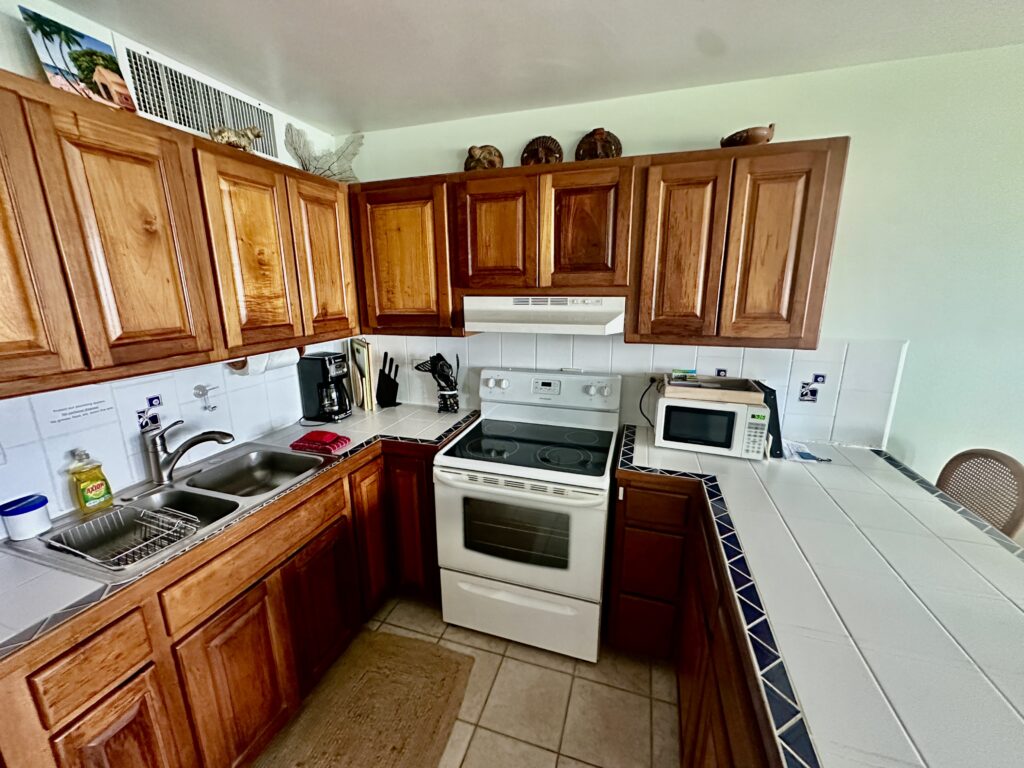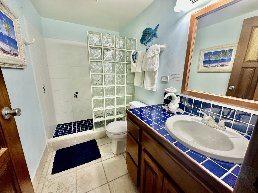 The owners call this their Caribbean jewel — and it is! The ground floor condo has a covered porch with a fabulous view overlooking the pool and the sea. You enter the condo into the spacious living/dining area. You’ll find comfortable chairs and a futon couch (which converts to a double sleeper) as well as dining seating for four both at the table and the counter. Just beyond is the fully equipped kitchen, and a little farther is the full bath. The bedroom with king bed is in the back of the condo.