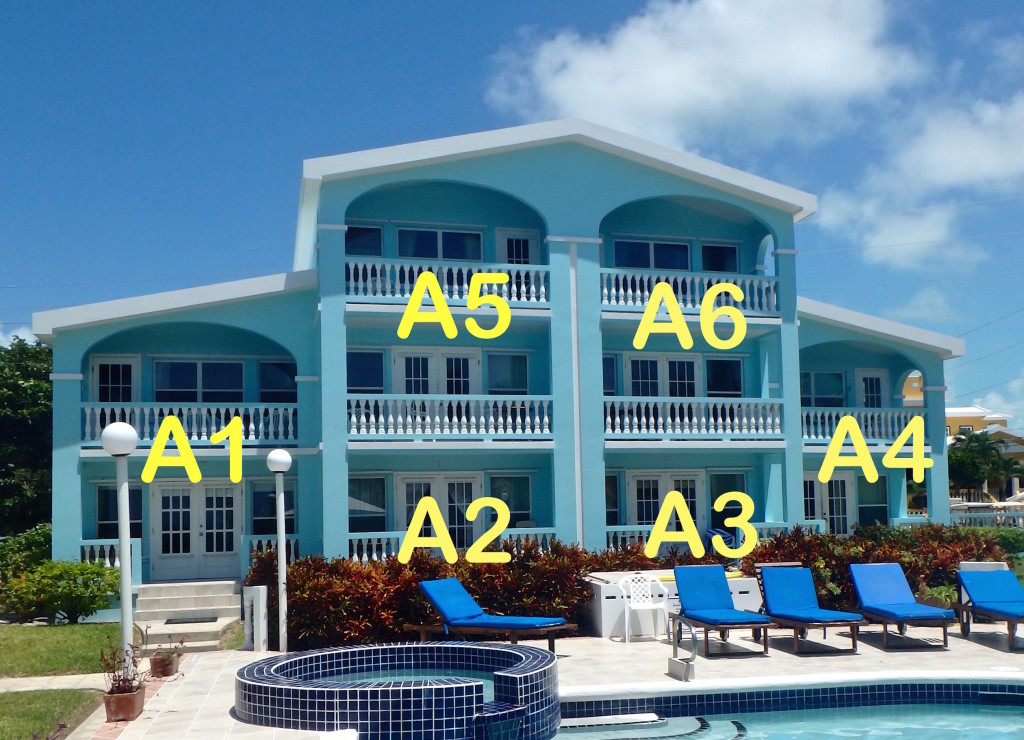 This 1750 square foot condo is on the 2nd and 3rd floors of a building and overlooks the pool with the sea & beach beyond.