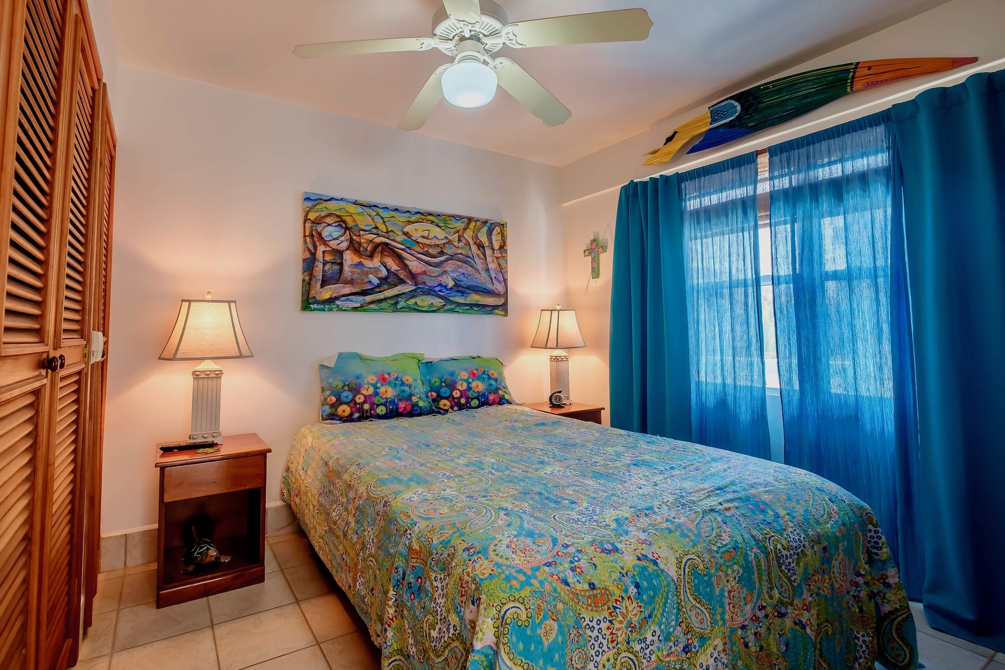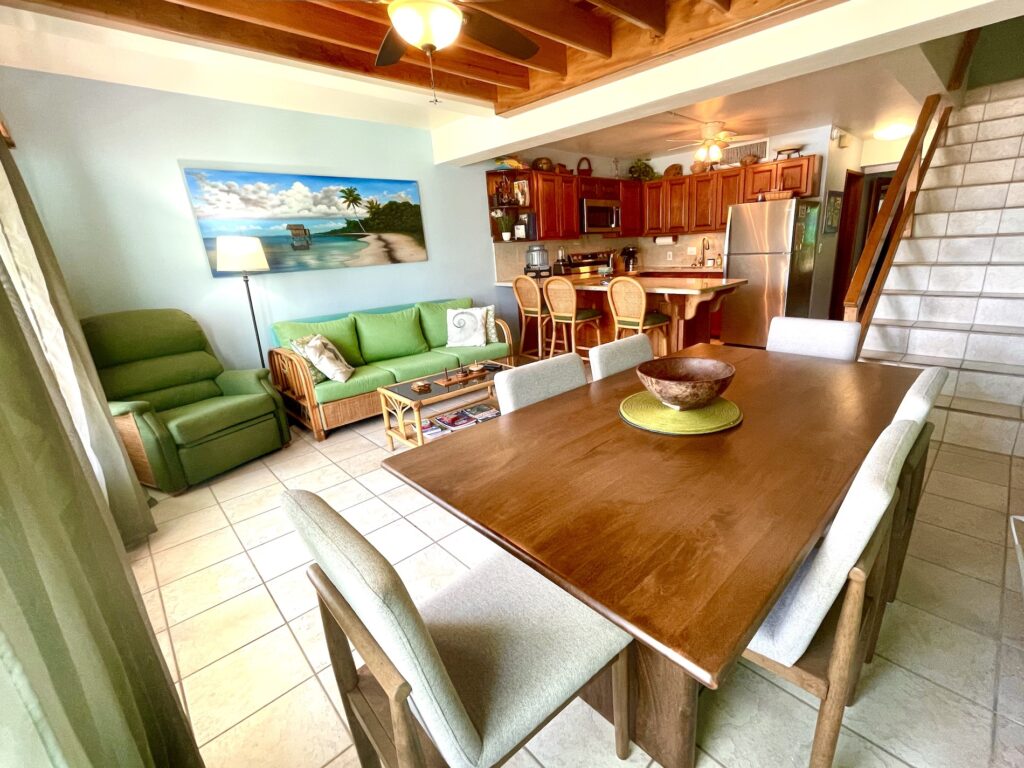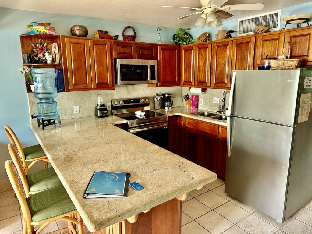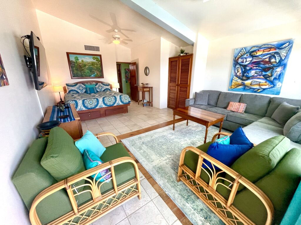 You enter the condo through the handmade stained glass door to find a bedroom to your right with a queen bed. Continue down the hall past the full bath and you’ll enter the living/dining area with queen sleeper sofa. The kitchen is on your right and has lovely granite countertops and backsplash, among other nice features. Straight ahead is the living/dining area and then veranda with a fabulous view of the pool and the sea.
