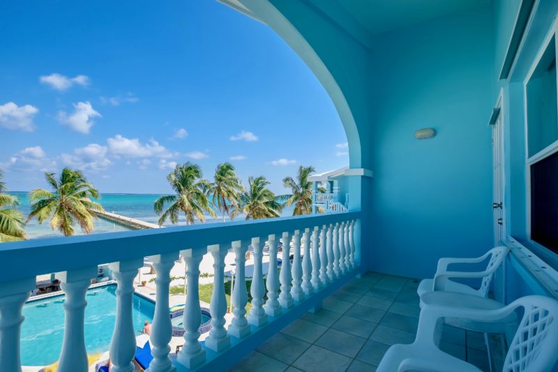 -a large bedroom with king bed, sitting area, and private veranda overlooking the pool and the sea.