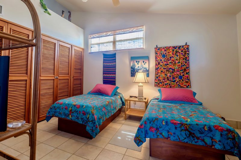 You enter the condo through the handmade stained glass door to find a bedroom to your right with a queen bed. Continue down the hall past the full bath and you’ll enter the living/dining area with queen sleeper sofa. The kitchen is on your right and has lovely granite countertops and backsplash, among other nice features. Straight ahead is the living/dining area and then veranda with a fabulous view of the pool and the sea.